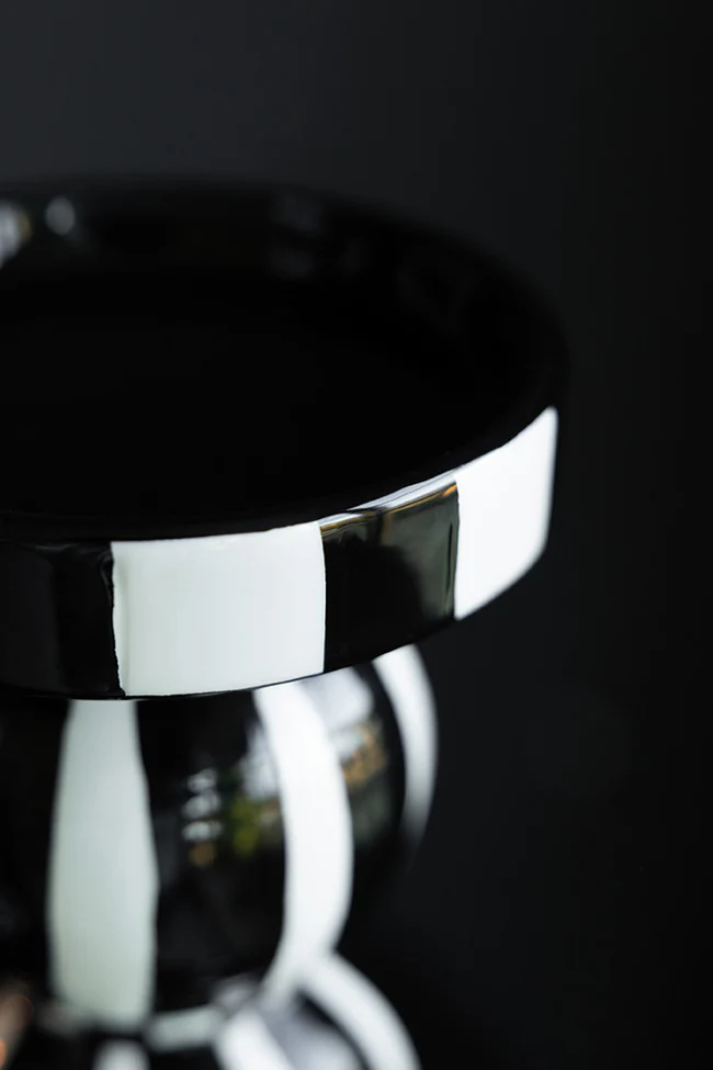 Tall, striking and ready to steal the show. These candle holders take everything you love about a classic circus stripe and turn up the drama. With its elegant height and bold monochrome design, it adds immediate impact to tablescapes, quirky home accessories, mantels and displays. Perfect for a sophisticated circus theme or a darker, moodier vibe, this piece looks amazing styled solo as a table centrepiece or mixed with other candle holders for extra visual fun. Pop in a candle, light it up, and let this tall beauty do what it does best – stand out effortlessly.