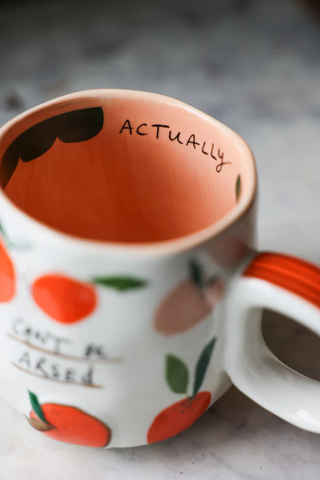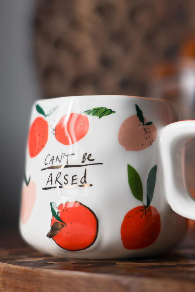We love the punchy colours of the oranges and peaches (the ‘arse’ in question, we assume) popping out of the creamy white background, and the contrasting peach glaze that adds depth and dimension to the look of this piece. It’s brilliantly unapologetic, and for that it earns pride of place in the Team RSG mug cupboard. It’s the perfect receptacle for hot drinks of any kind – if you can be bothered to make them, of course.