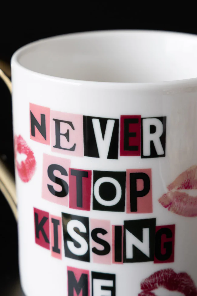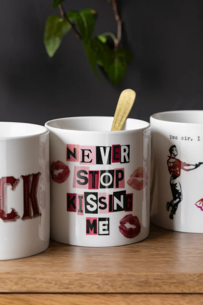 Smooches, please – and keep 'em coming. This gorgeous statement mug is the ultimate love note in ceramic form. Featuring playful cut-out lettering and a smattering of lipstick kisses, this white mug is romantic, cheeky and a little bit irresistible. Whether you’re gifting it to your long-time lover, a new crush, as a funny gift, or even a treat for yourself (self-love deserves kisses too), this funny mug brings all the flirt without any of the cringe. It’s perfect for cosy mornings, love-fuelled cuppas, and spontaneous kitchen kissing. So put the kettle on, pucker up and let the mug do the sweet-talking. You can pop this mug in the dishwasher using a mild detergent, though hand-washing is recommended to maintain the vibrancy of the design. Due to the metal handle, it’s not microwave-friendly.