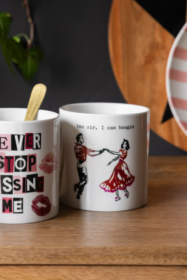 Start your day with a little sass and a lot of swing. This gorgeous white coffee mug features a vintage-style dance duo mid-boogie with the iconic line “Yes sir, I can boogie” – because caffeine, tea time and disco energy are all best friends. Whether you’re shimmying into your morning routine kitchenware or two-stepping into your afternoon slump, this cool mug is here to keep the vibe high and the coffee strong. It’s charming, cheeky and guaranteed to make you smile, even before the caffeine kicks in. It’s a perfect gift mug for the boogie-loving babes in your life, or just a joyful little treat for yourself. Pop the kettle on – your new favourite mug is ready to dance. While this mug is dishwasher-safe when using a low-abrasive detergent, we recommend hand-washing it to help preserve the print over time. Please note that this mug is not microwave-safe due to its metal handle.
