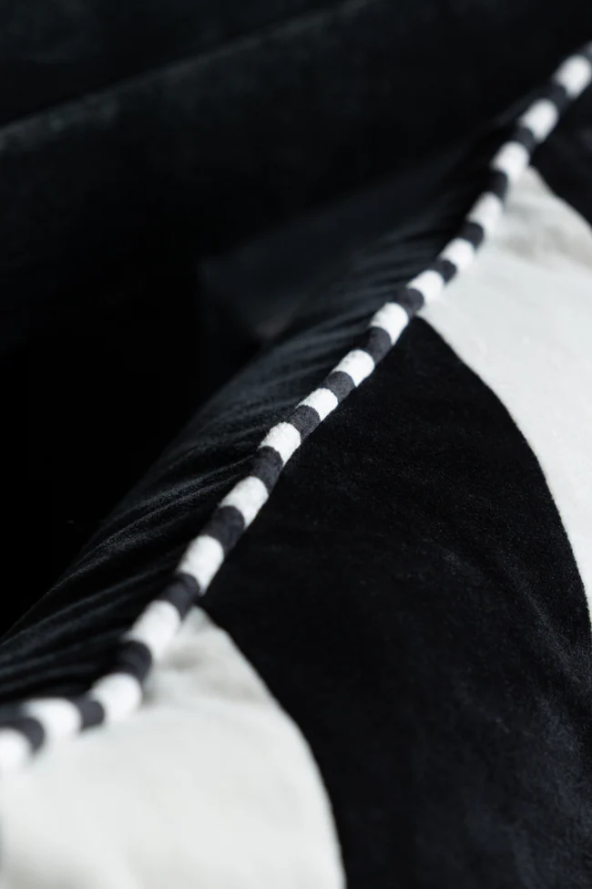 This one’s for the people who love a bit of pattern, but still want everything to feel calm and put together. The chic palette of our black and white cushion keeps things classic, but the thick diagonal velvet stripes give it that extra something, so it doesn’t disappear into the sofa. It’s bold without being loud – the interior equivalent of a really good black blazer. Around the edge of this velvet cushion, you’ve got a contrasting horizontal striped piping, and the back is a clean, solid black for when you want to tone things down a notch. Two moods, one cushion: zero effort. The weighty velvet of this throw cushion is seriously soft, making it feel as good as it looks, whether it’s propping you up for a film night or simply sitting there on the sofa looking pretty. Simple, graphic and easy to live with, it also helps that the monochrome palette goes with everything!