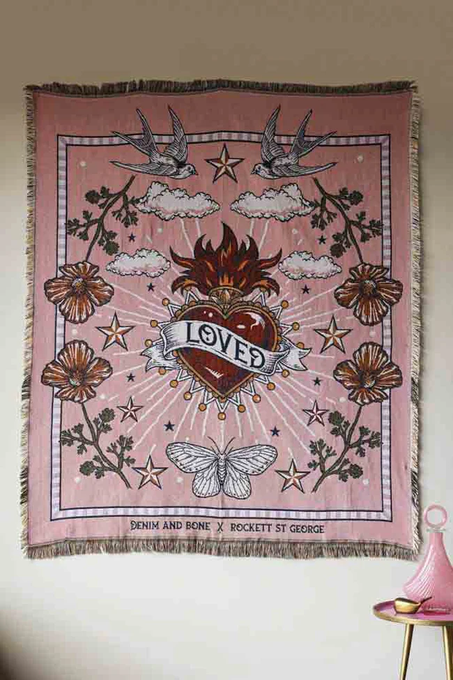 Working in partnership with Rockett St George, the Denim & Bone Pink Loved Woven Cotton Throw will add an oh-so-comfy layer to your sofas or beds. Showcasing a gorgeous vintage design, this beautiful woven throw is made from 100% cotton showcasing a heavenly design of a rich Milagros style heart, wild poppies, swallows, moths and clouds on a pretty pink background. What’s more, this cotton throw features a mixture of black and yellow thread fringe on the sides and a multicoloured fringe on the top and bottom. This large cotton throw measures 160cm in width and 190cm in length.